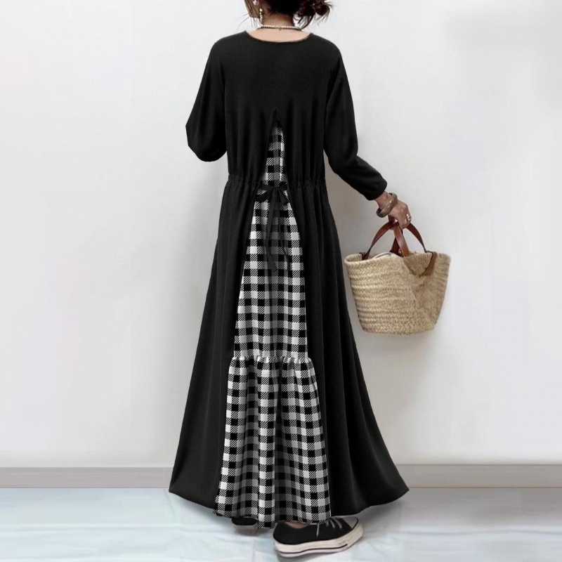 チェック柄長袖タイドドレス バックドレス チェック柄長袖ドレス